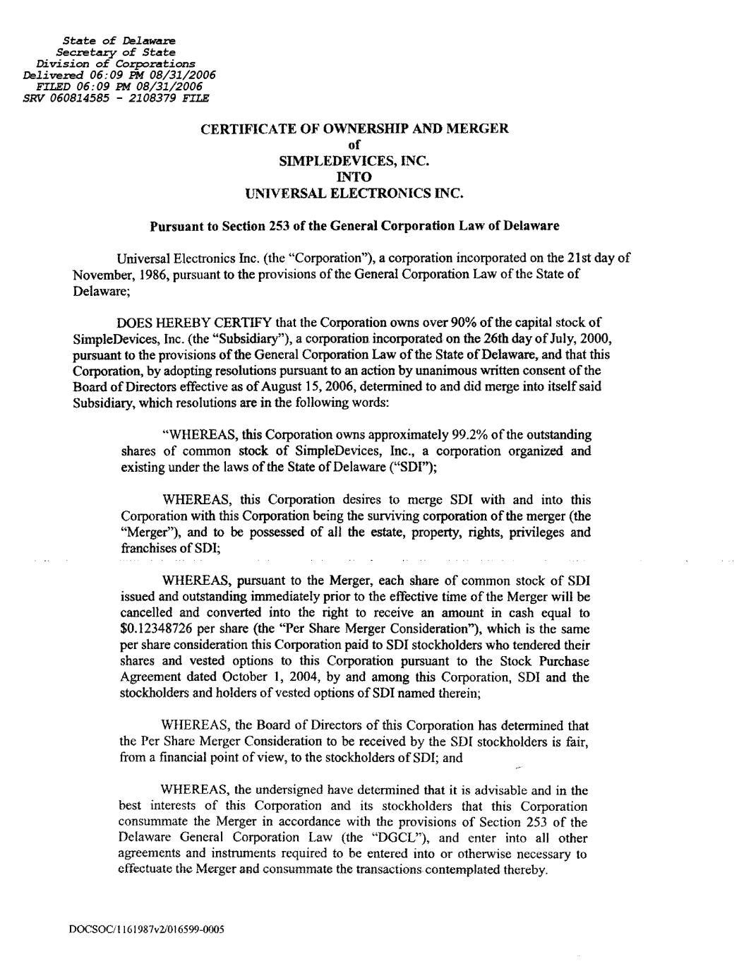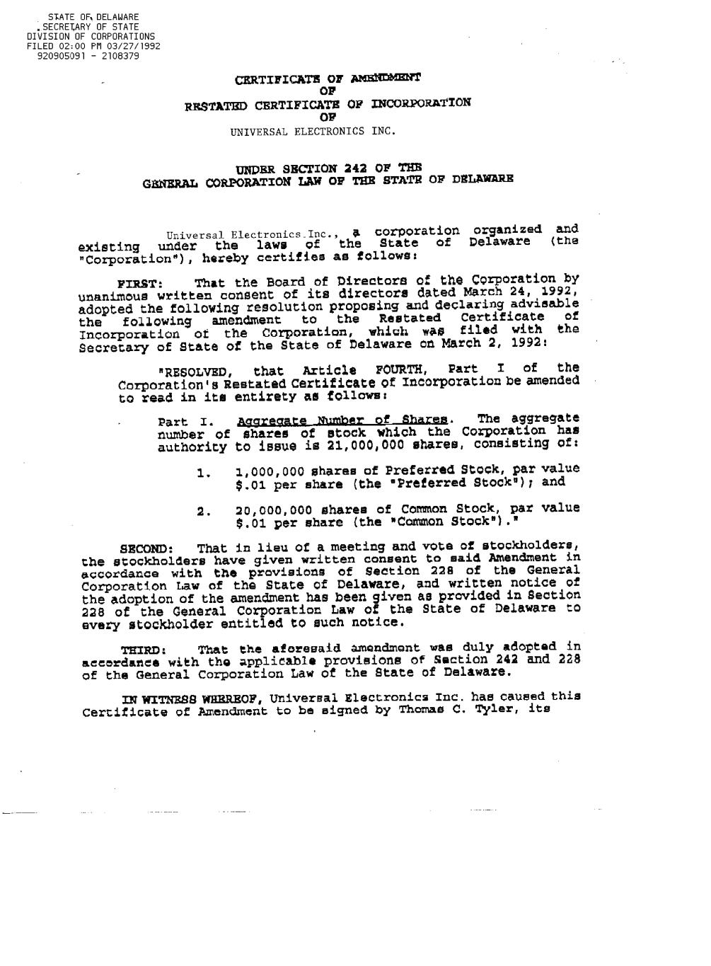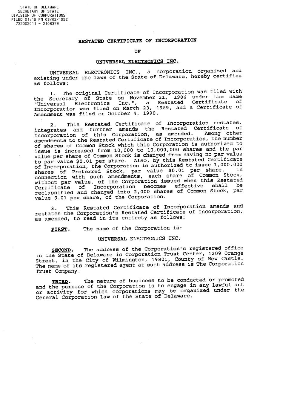 Universal Electronics Inc. ("UEI", "we", "our", "us", or the "Company") was incorporated under the laws of Delaware in 1986 and began operations in 1987. The principal executive offices are located at 15147 N. Scottsdale Road, Suite H300, Scottsdale, Arizona 85254. As used herein, the terms "we", "us" and "our" refer to UEI and its subsidiaries unless the context indicates the contrary.