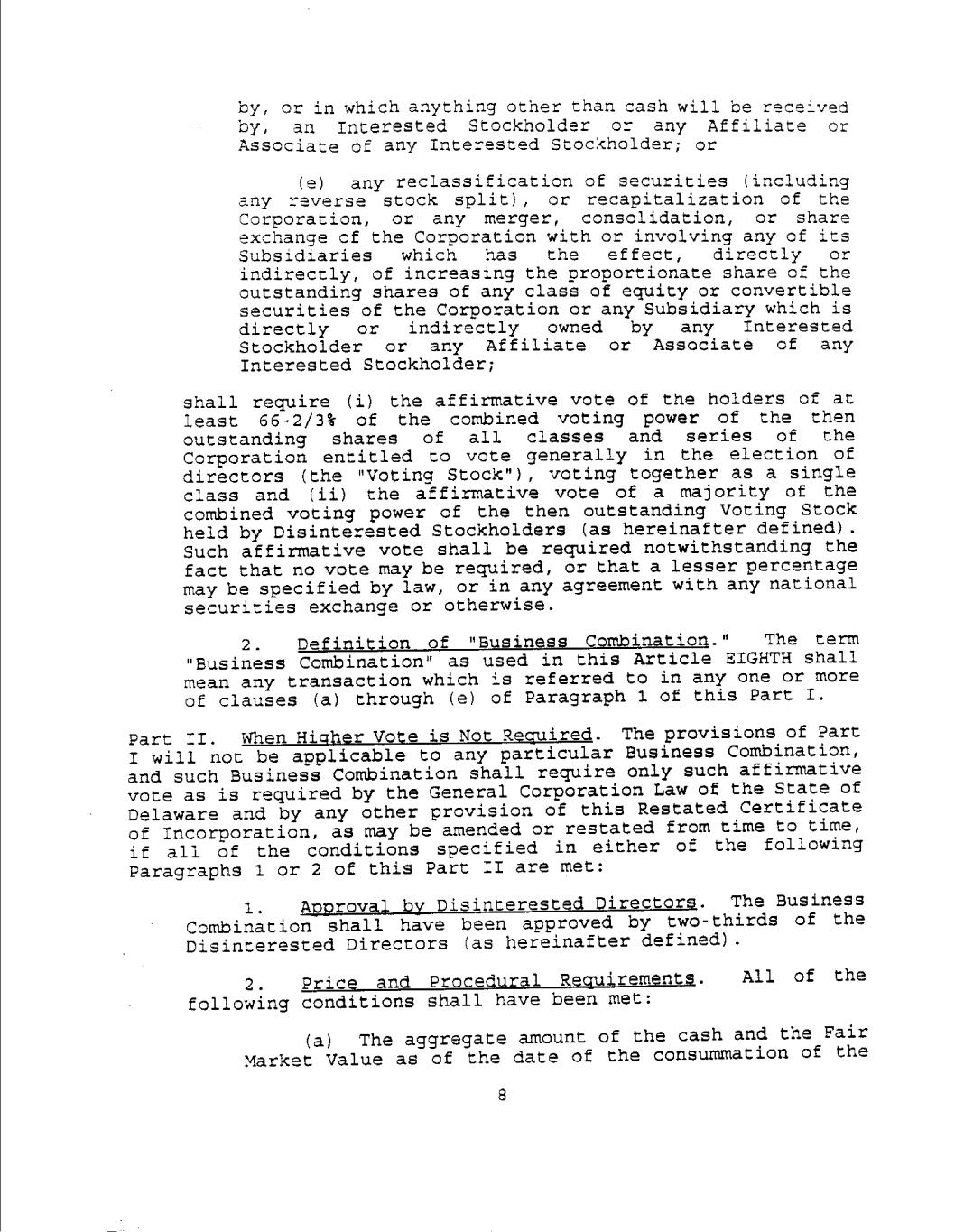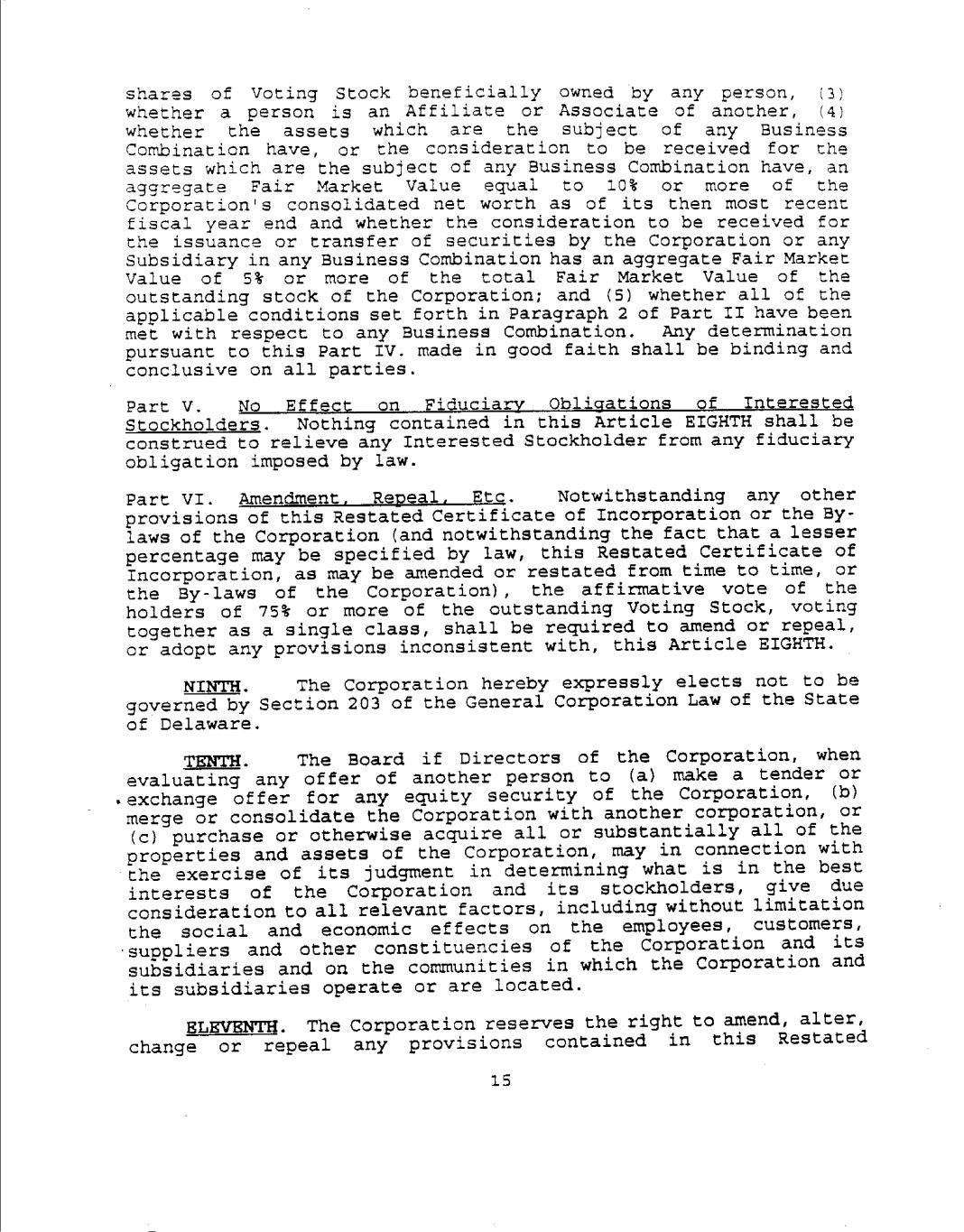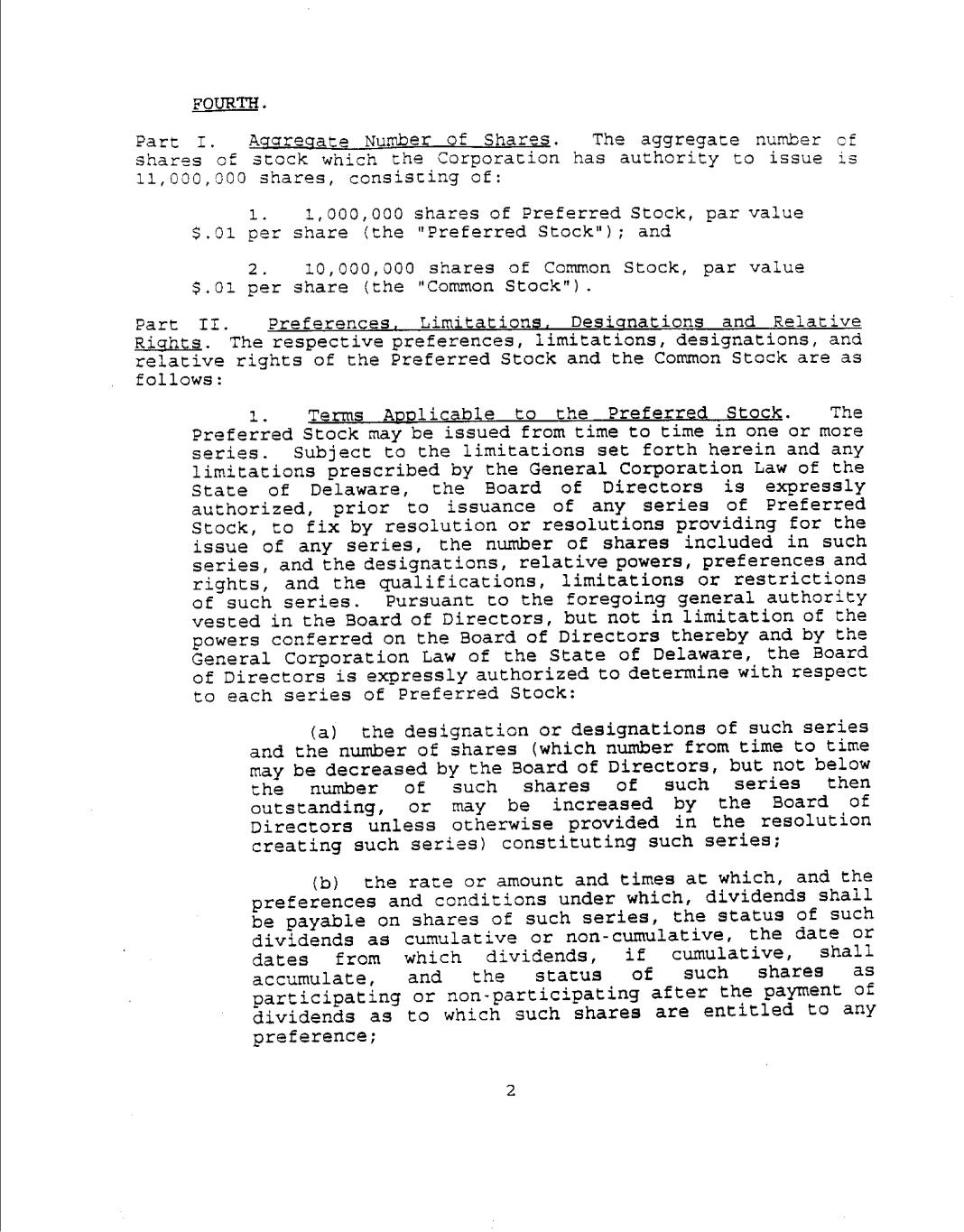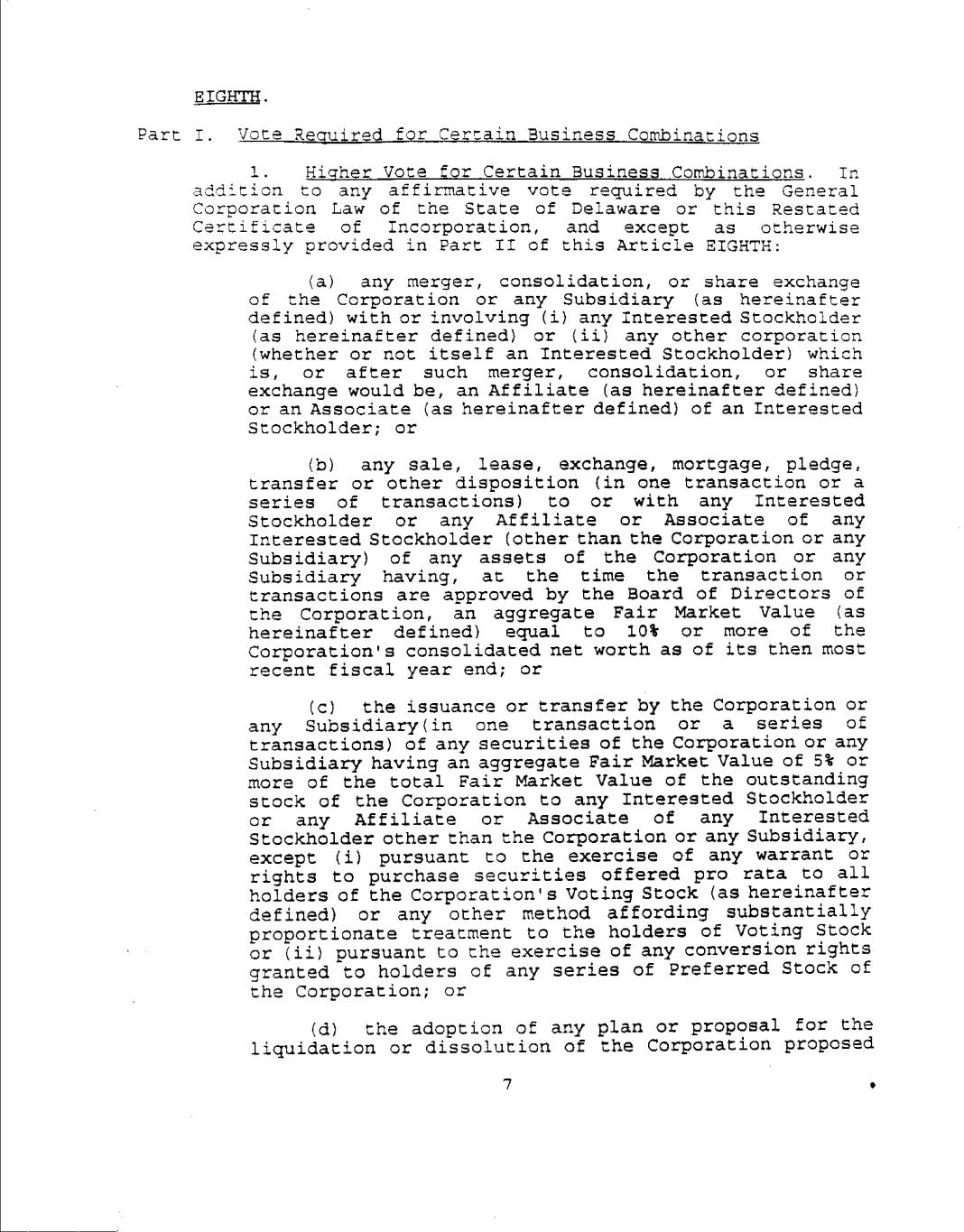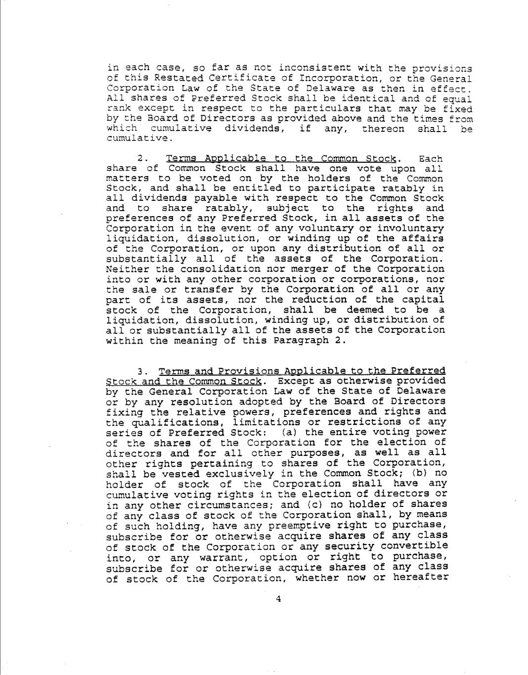 | 4.1 | Article Eighth of our Restated Certificate of Incorporation, as amended, contains certain provisions restricting business combinations with interested stockholders under certain circumstances and imposing higher voting requirements for the approval of certain transactions unless the transaction has been approved by two-thirds of the disinterested directors or fair price provisions have been met. (incorporated by reference to Exhibit 3.3 to the Company's Annual Report on Form 10-K for the year ended December 31, 1995 filed on April 1, 1996 (File No. 0-21044)) (paper file) |