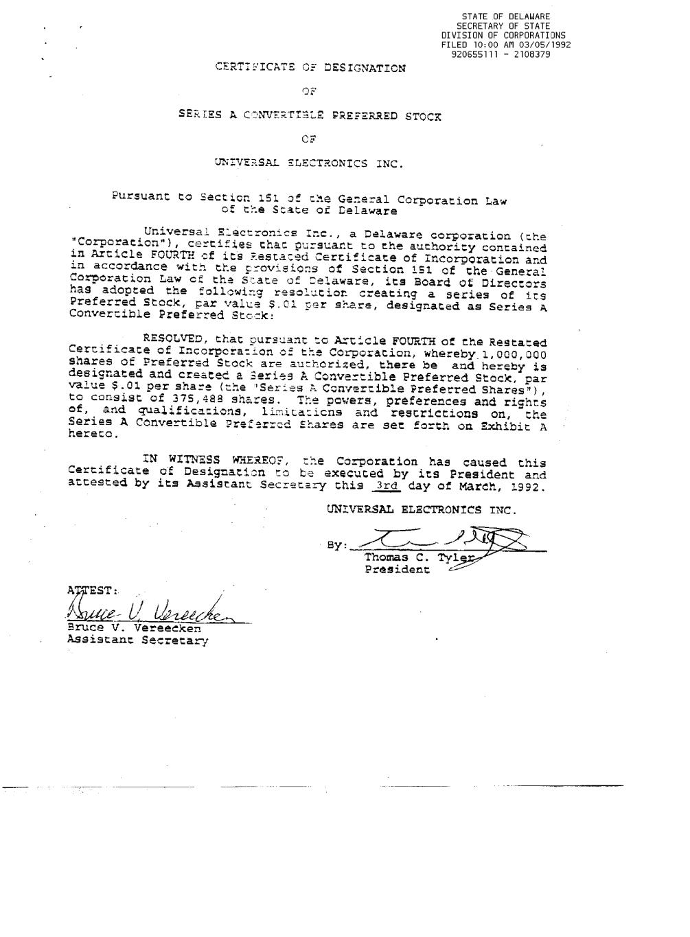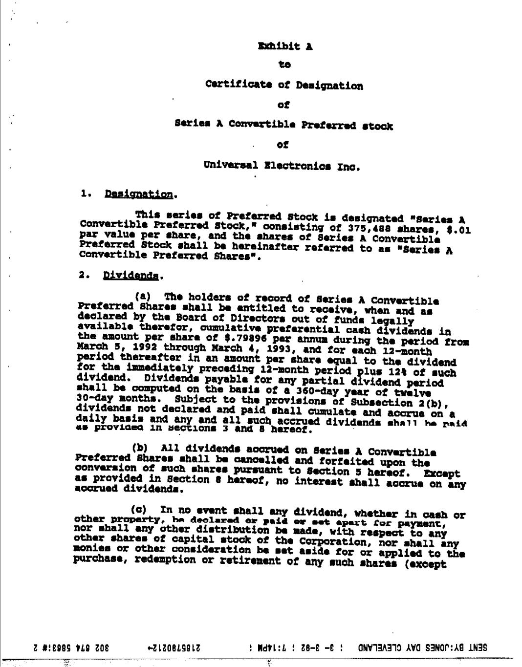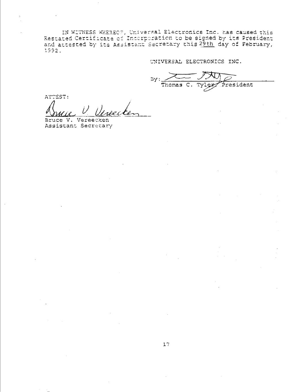 | *10.3 | Form of Salary Continuation Agreement by and between Universal Electronics Inc. and certain employees (incorporated by reference to Exhibit 10.39 to the Company's Annual Report on Form 10-K for the year ended December 31, 1999 filed on March 30, 2000 (File No. 0-21044)) (paper file) |