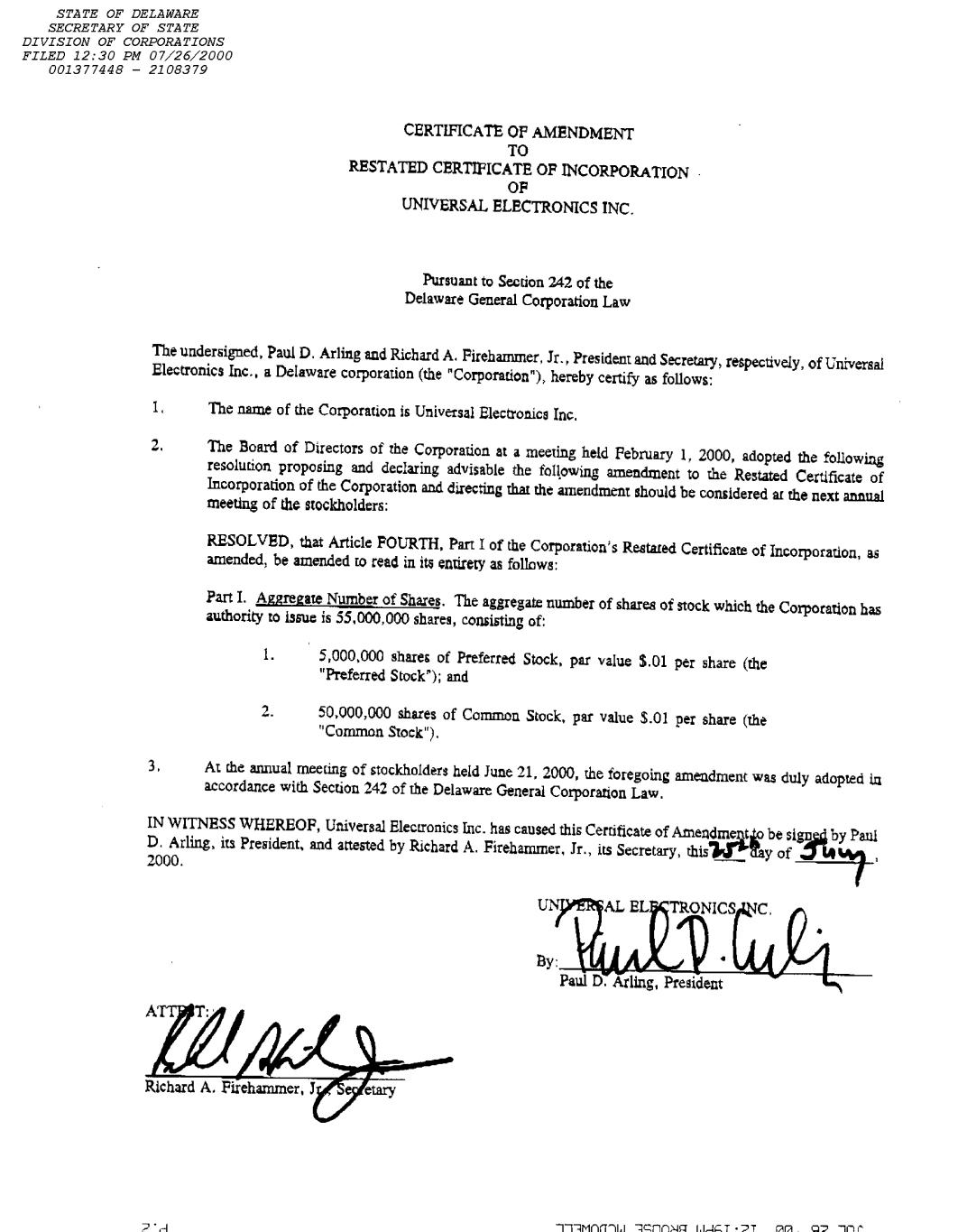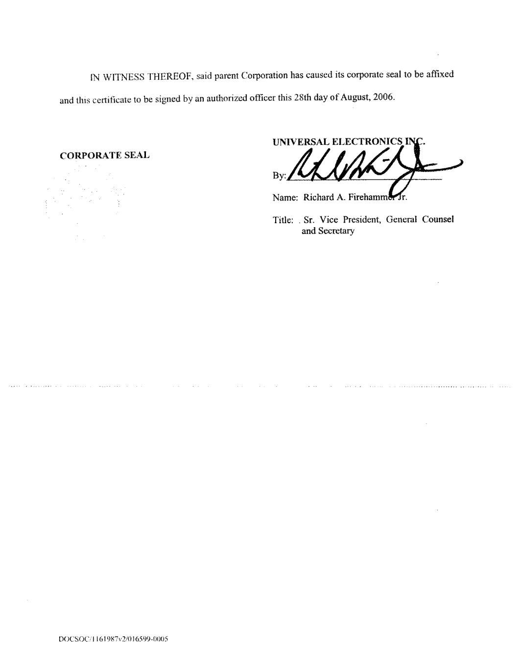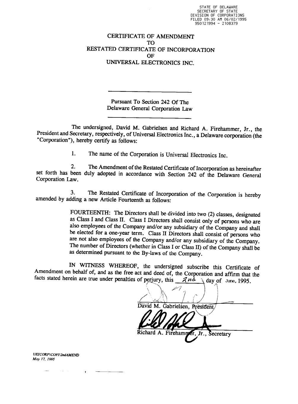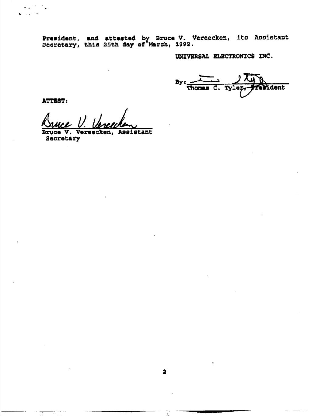 | *10.2 | Form of Amendment to Salary Continuation Agreement by and between Universal Electronics Inc. and certain employees (incorporated by reference to Exhibit 10.26 to the Company's Annual Report on Form 10-K for the year ended December 31, 1997, filed on March 30, 1998 (File No. 0-21044)) (paper file) |